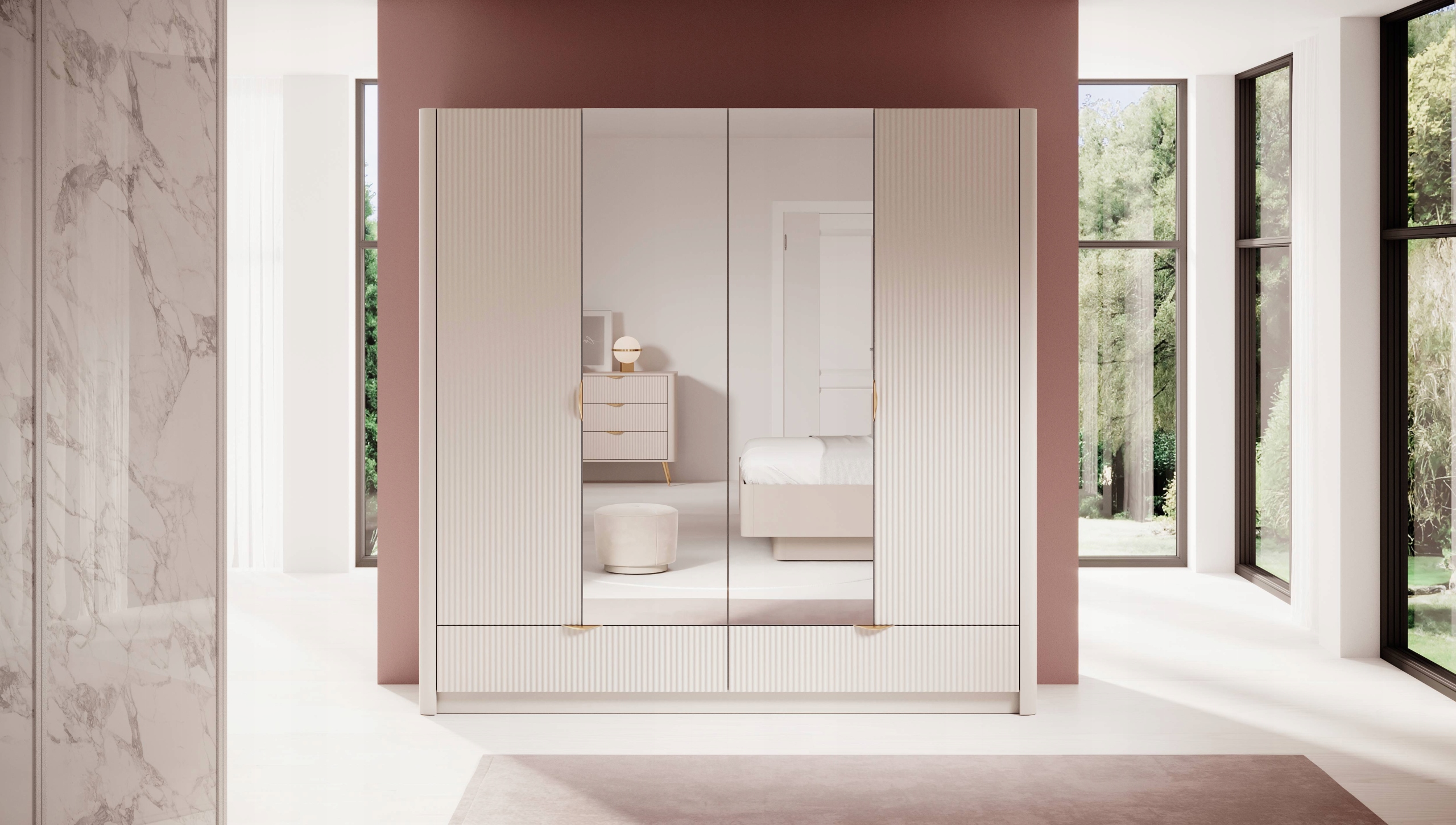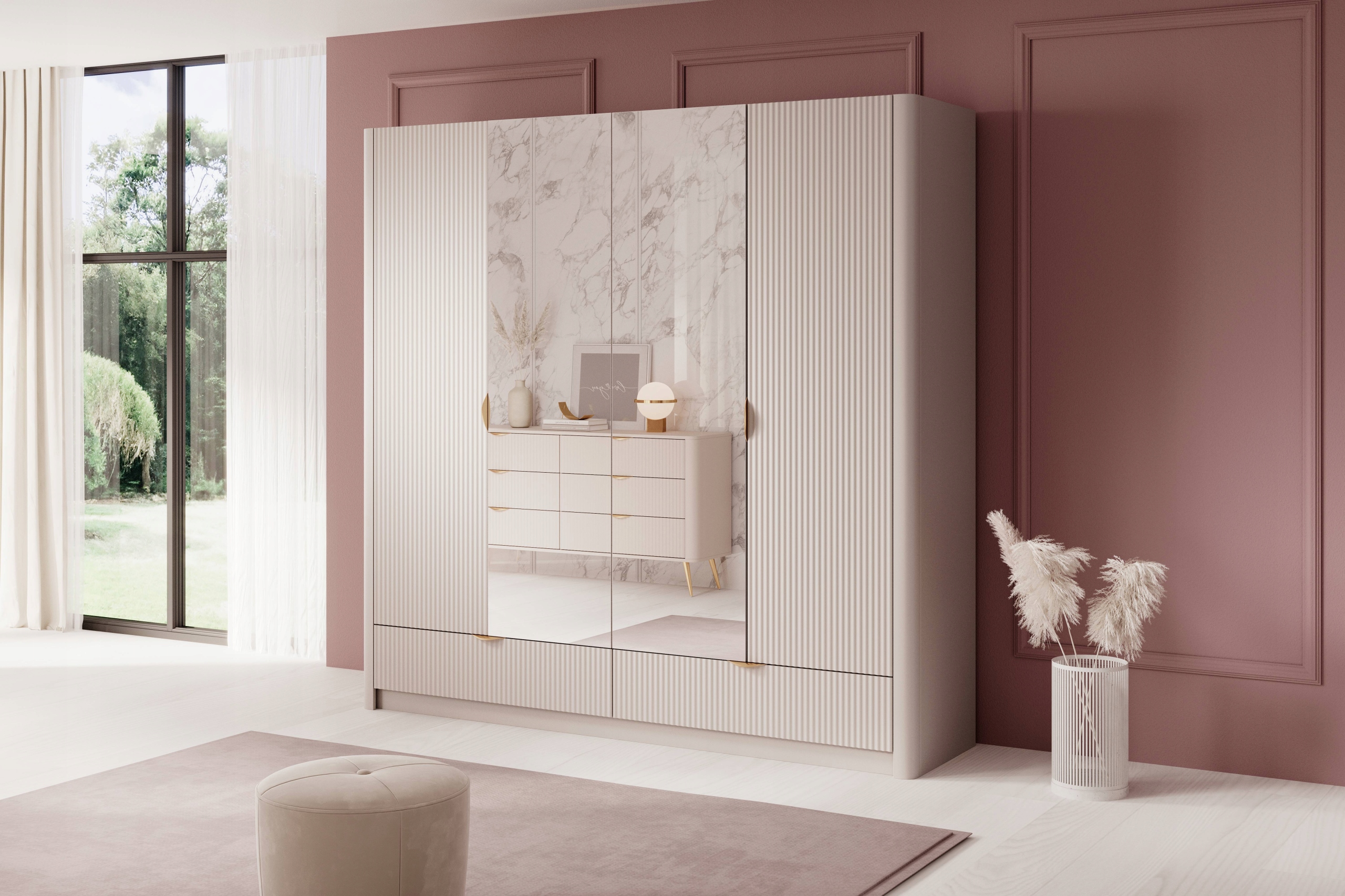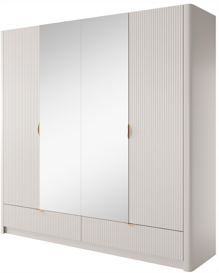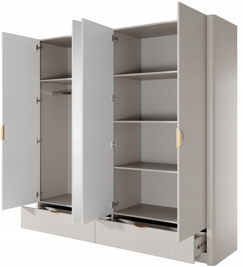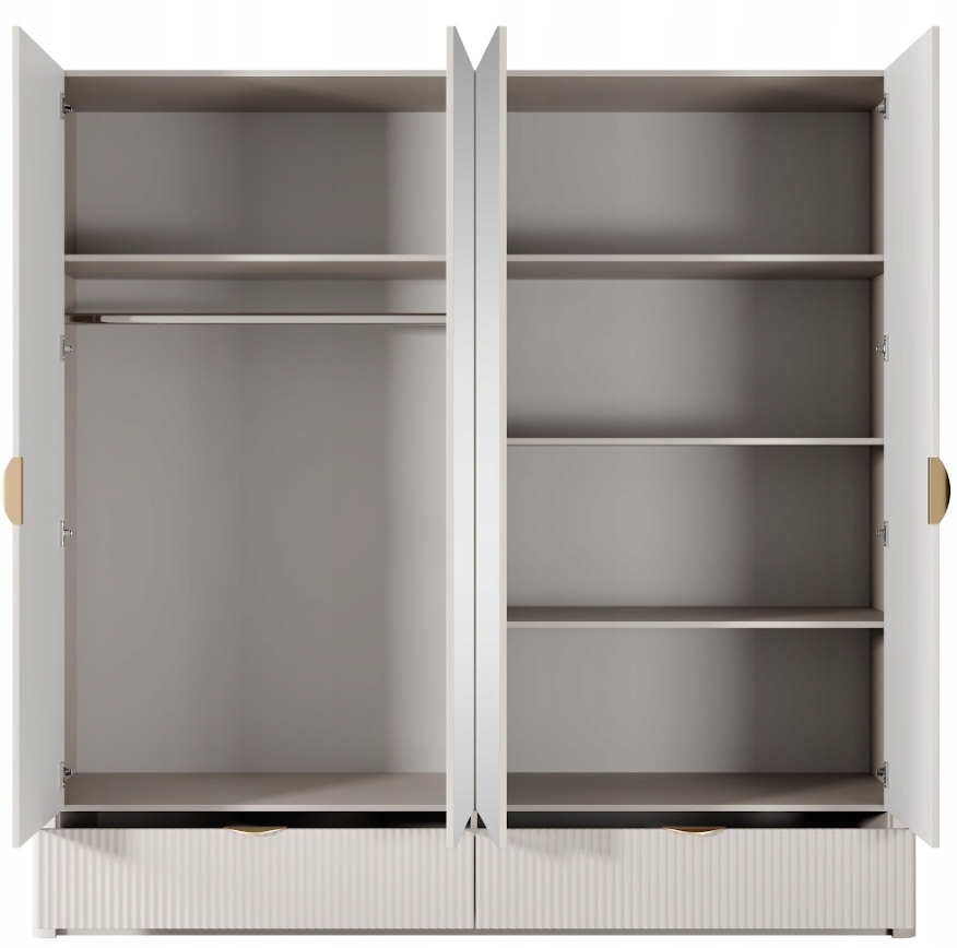 Szafa z kolekcji LANTE to połączenie nowoczesnego designu, eleganckich detali i funkcjonalności na najwyższym poziomie. Beżowa kolorystyka nadaje meblowi subtelnego uroku, a złote akcenty w postaci uchwytów i wysokich, walcowatych nóżek podkreślają jego luksusowy charakter. Frezowane fronty oraz zaokrąglone listwy boczne sprawiają, że bryła prezentuje się wyjątkowo lekko i harmonijnie, idealnie wpisując się w styl glamour. Dzięki przestronnemu wnętrzu z drążkiem na ubrania i wygodnymi półkami szafa sprawdzi się zarówno w sypialni, jak i w garderobie lub przedpokoju, oferując miejsce na uporządkowane przechowywanie ubrań sezonowych i codziennych. Konstrukcja została wykonana z trwałych materiałów – fronty z frezowanego MDF, korpus z płyty laminowanej, a plecy z płyty HDF w dopasowanym odcieniu. Obrzeża zabezpieczono trwałą okleiną ABS. Złote metalowe uchwyty i nogi dopełniają eleganckiego wyglądu i zapewniają solidność. Mebel wyprodukowany w Polsce, przeznaczony jest do samodzielnego montażu.