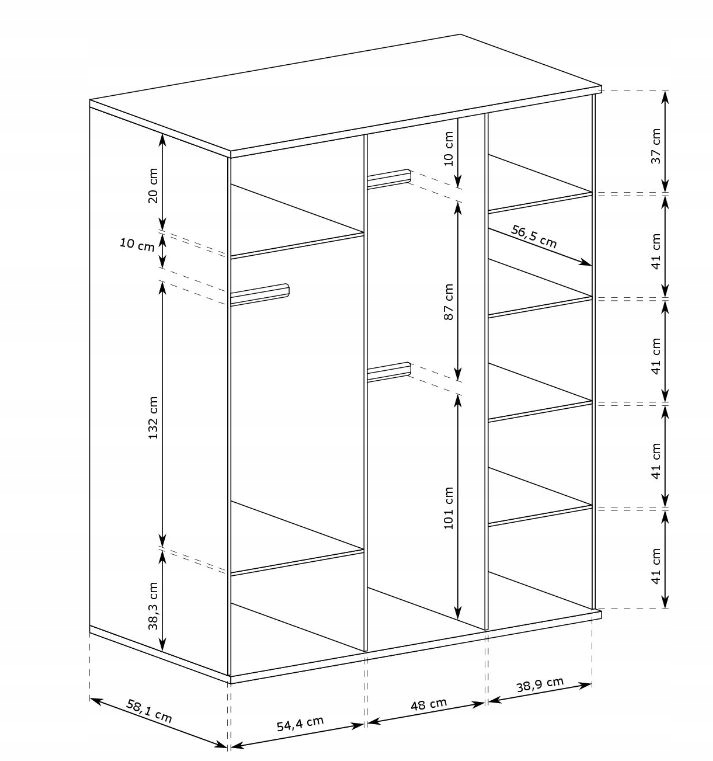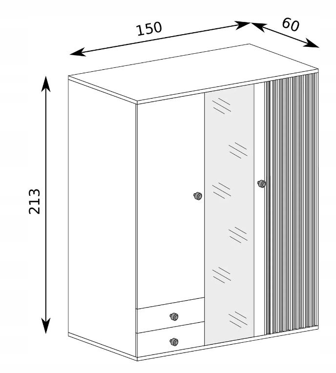 Z trzema solidnymi drzwiami, z których jedno ma duże lustro, szafa CAMPA optycznie powiększa przestrzeń i umożliwia szybkie sprawdzenie wyglądu przed wyjściem. Funkcjonalne wnętrze z półkami i wieszakami oferuje wygodne przechowywanie, a dwie szuflady zapewniają dodatkową przestrzeń na drobne akcesoria.