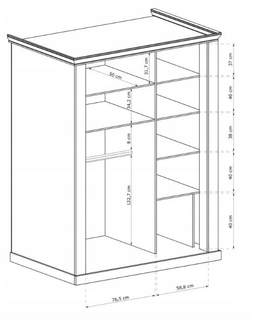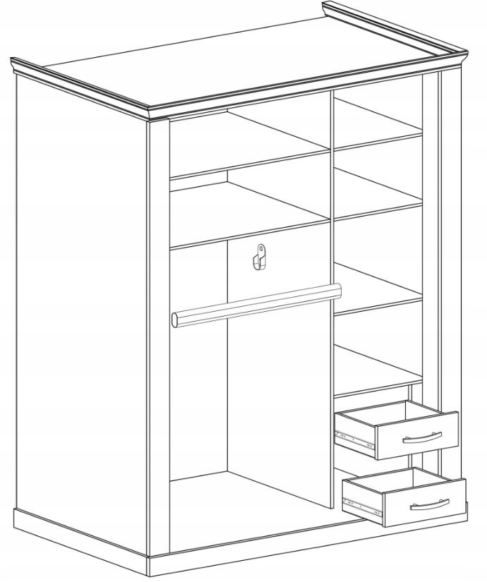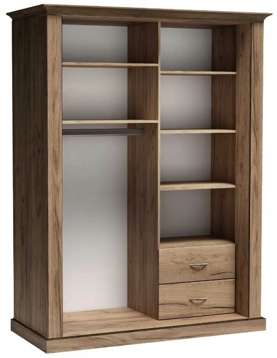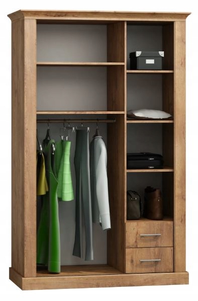 Inteligentnie zaprojektowane wnętrze oferuje solidne półki oraz dwie szuflady, idealne do przechowywania ubrań i akcesoriów. Dodatkowy drążek zapewnia wygodne wieszanie odzieży. Szafa CANITA to połączenie estetyki i funkcjonalności, które zachwyci każdego miłośnika eleganckich wnętrz.