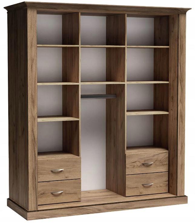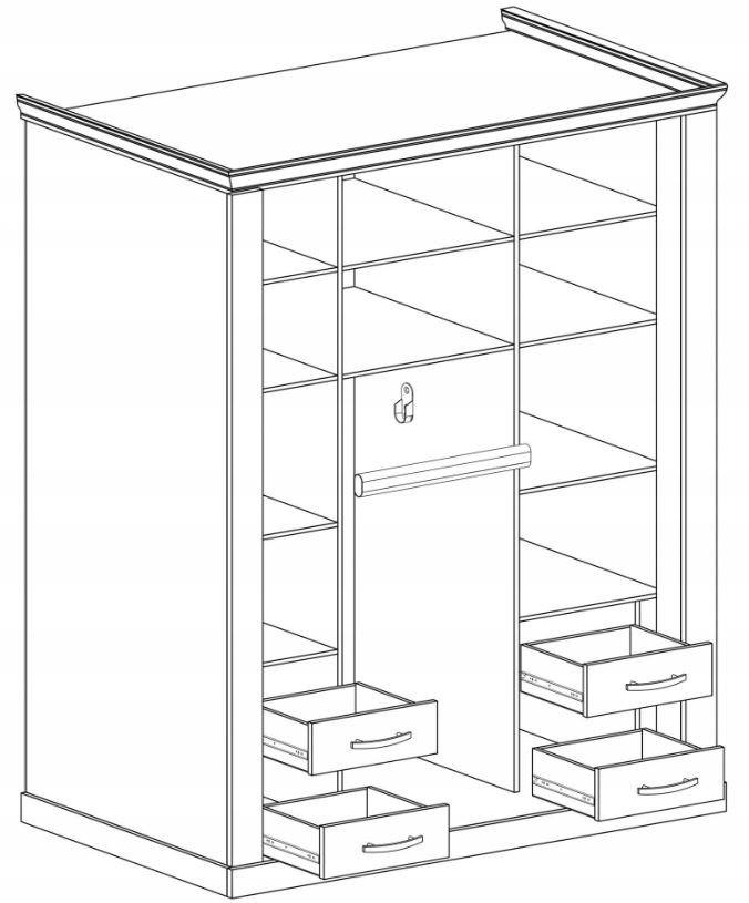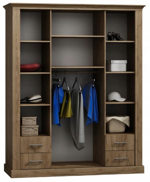 Wnętrze szafy oferuje solidne półki oraz cztery szuflady, które pozwalają na łatwą organizację ubrań i akcesoriów. Dodatkowy drążek na ubrania zapewnia wygodne przechowywanie odzieży bez zagnieceń. Szafa CANITA łączy w sobie nowoczesną funkcjonalność z klasycznym designem, tworząc elegancki element wyposażenia, który zachwyci każdego miłośnika stylowych wnętrz.