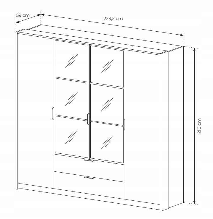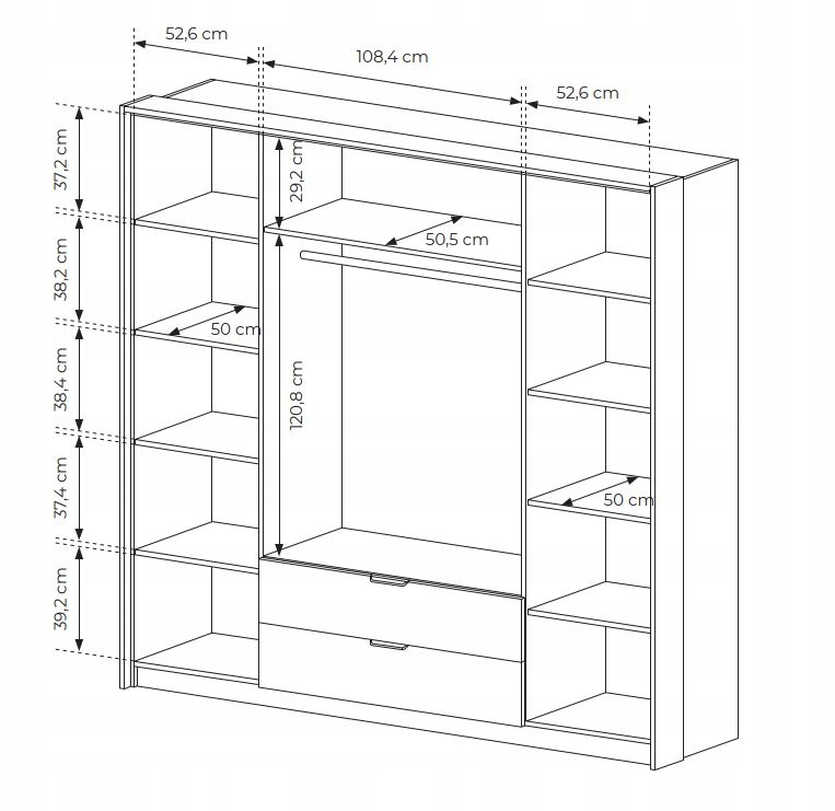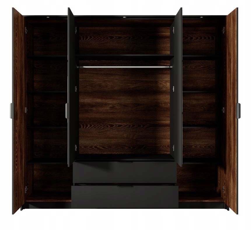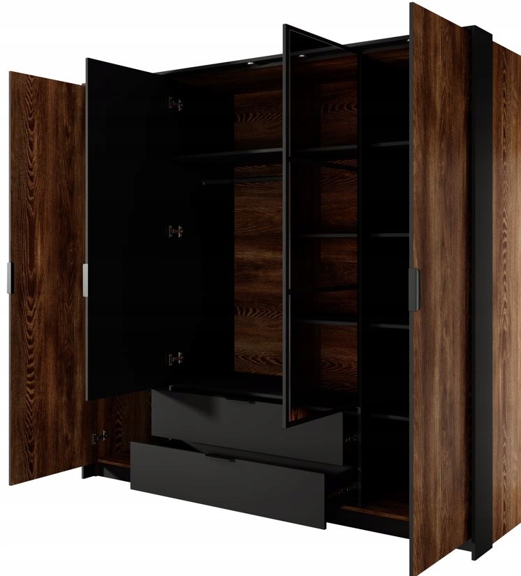 Szafa oferuje przemyślany układ przechowywania. Po bokach znajdują się półki, idealne na odzież, dodatki czy akcesoria, a centralna część wyposażona jest w wieszak, co umożliwia wygodne przechowywanie dłuższych ubrań, takich jak płaszcze czy marynarki. Na dole umieszczone są dwie pojemne szuflady, idealne do przechowywania mniejszych przedmiotów lub bielizny, dzięki czemu organizacja ubrań oraz codziennych akcesoriów jest łatwa i wygodna.