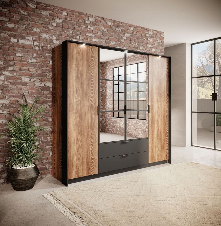 Szafa z kolekcji MILTON to połączenie funkcjonalności i nowoczesnego stylu, które sprawdzi się idealnie zarówno w sypialni, jak i w przedpokoju czy wiatrołapie. Jej industrialny design łączy elegancję z praktycznością, tworząc efektowną ozdobę każdego wnętrza. Wykończenie w odcieniu kasztanu w zestawieniu z antracytowymi akcentami nadaje jej wyrazistego charakteru, a centralne lustro dodaje elegancji, optycznie powiększając i rozjaśniając przestrzeń.