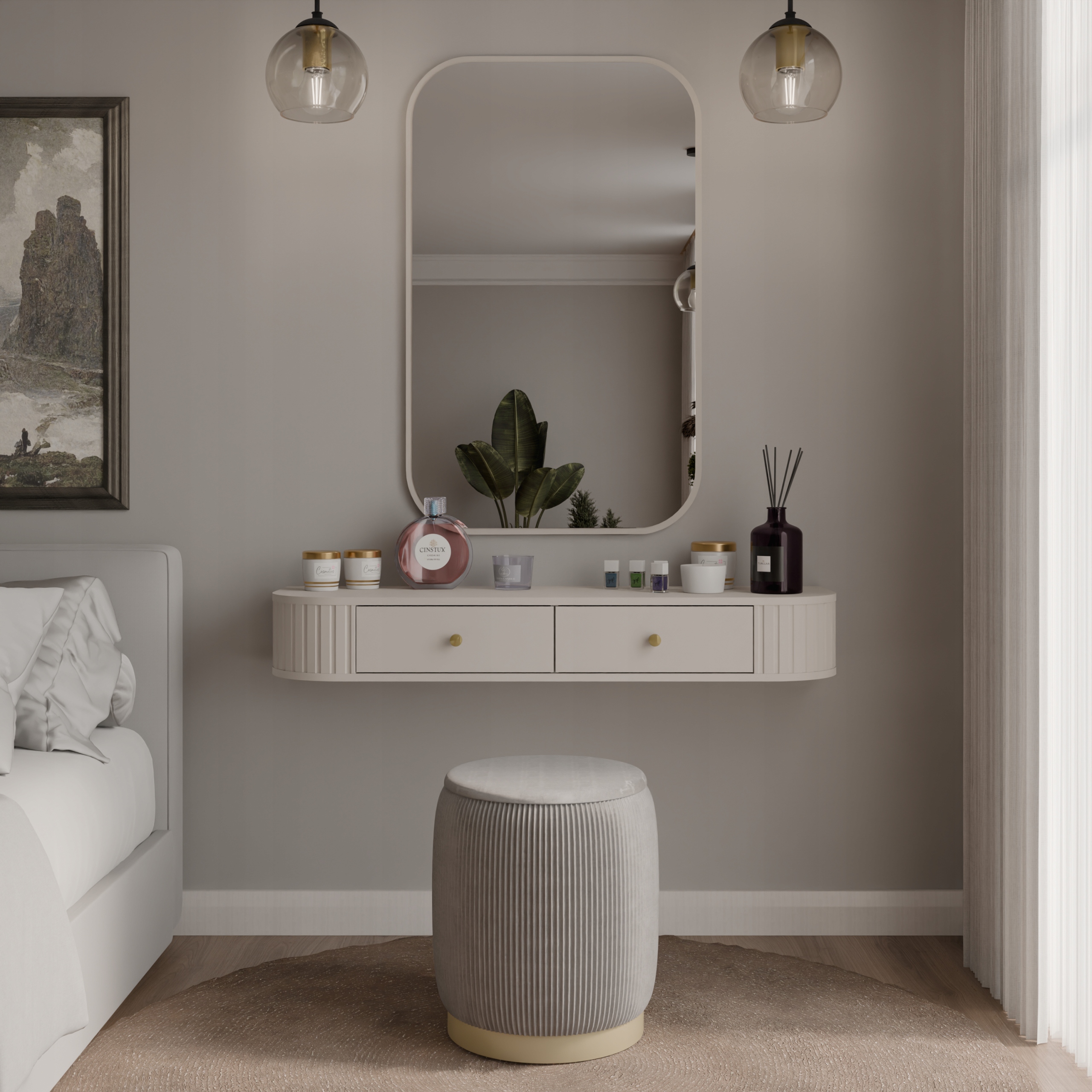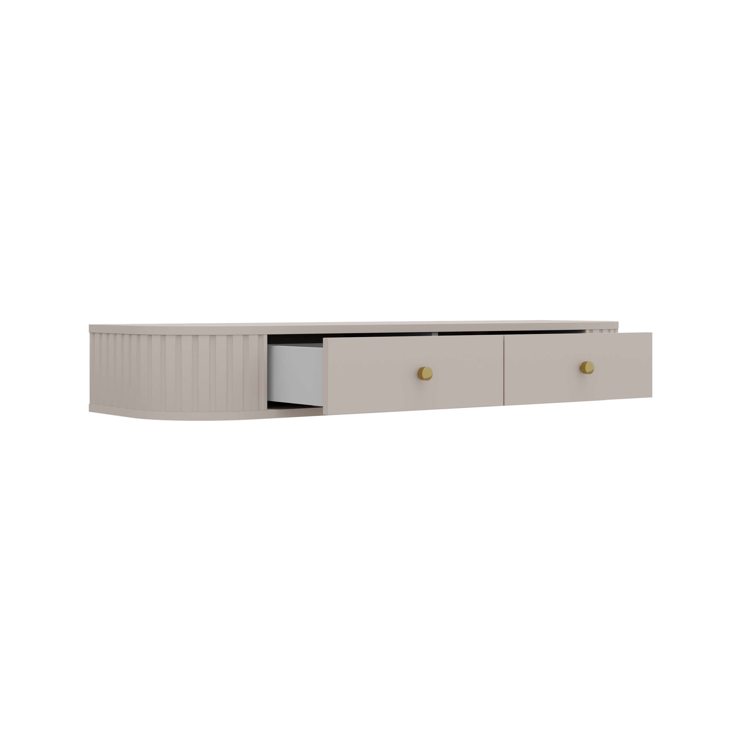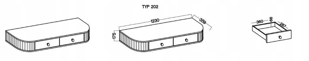 Toaletka z kolekcji OVALIO stanowi praktyczny i stylowy element wyposażenia sypialni, garderoby lub przedpokoju. Dwie pojemne szuflady zapewniają wygodne miejsce na kosmetyki oraz drobne akcesoria codziennego użytku. Wisząca konstrukcja nadaje bryle lekkości i pozwala optycznie uporządkować przestrzeń, a frezowane boki stanowią charakterystyczny element dekoracyjny całej kolekcji.