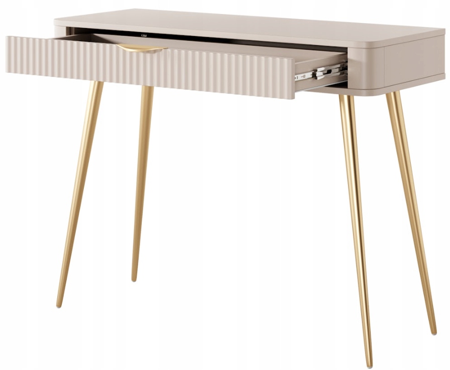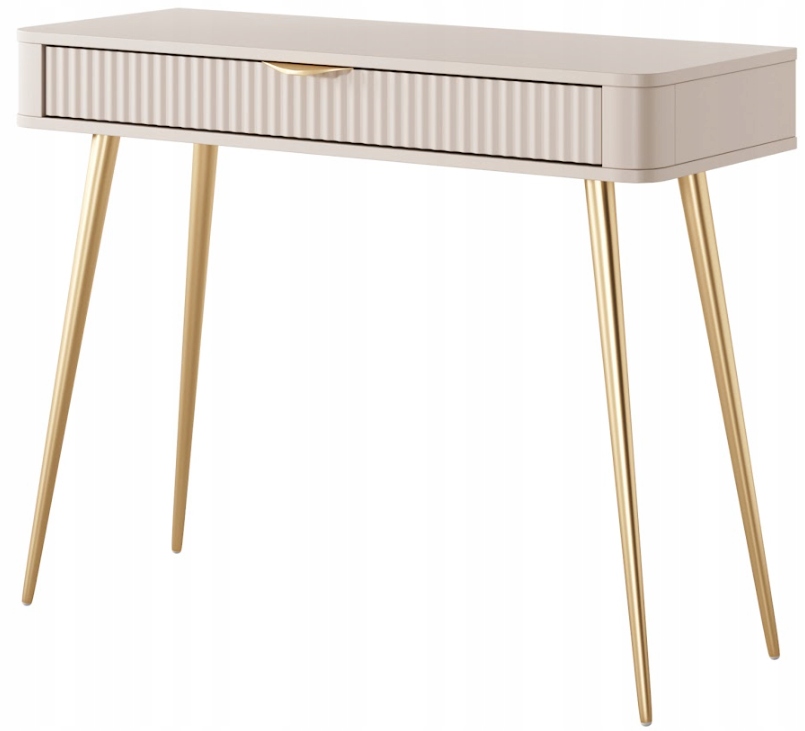 Toaletka z kolekcji LANTE to połączenie wyjątkowego designu z funkcjonalnością, które idealnie wpisuje się w nowoczesne, eleganckie wnętrza. Beżowa kolorystyka tworzy spokojną, ciepłą bazę, sprzyjającą codziennym rytuałom pielęgnacyjnym. Złote, walcowate nóżki i dopasowane uchwyty dodają lekkości, jednocześnie nadając meblowi wyrafinowanego charakteru.