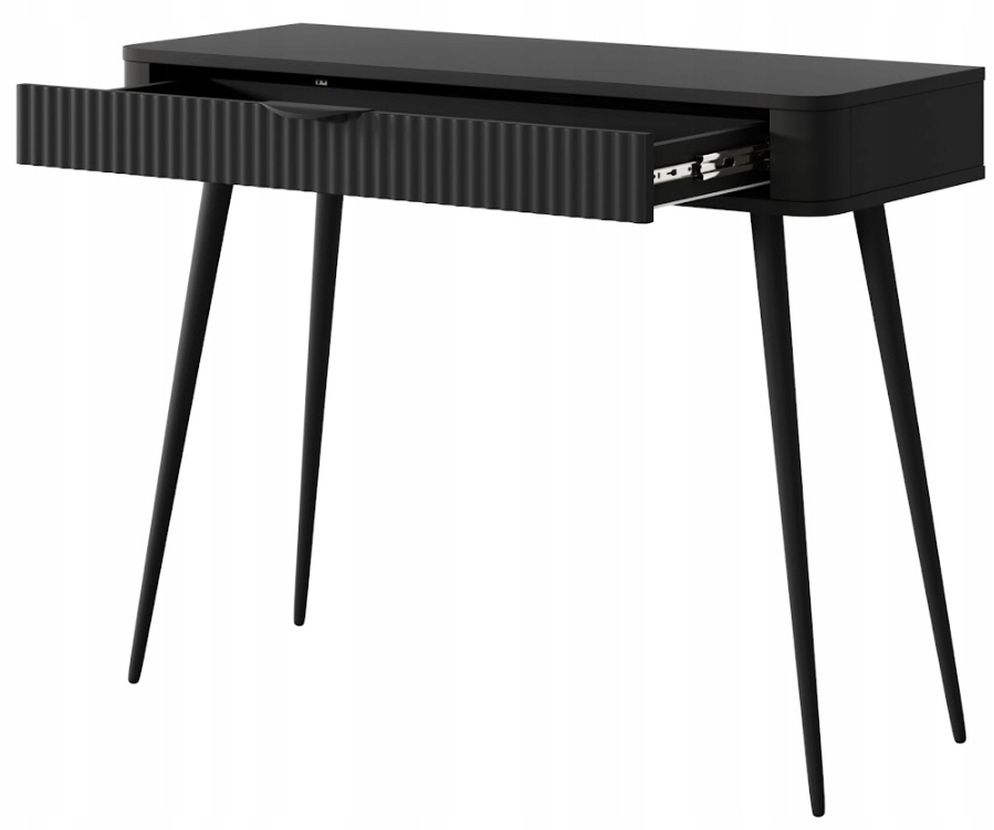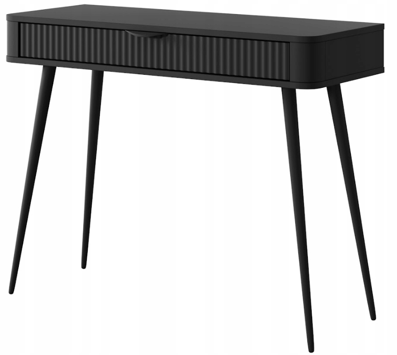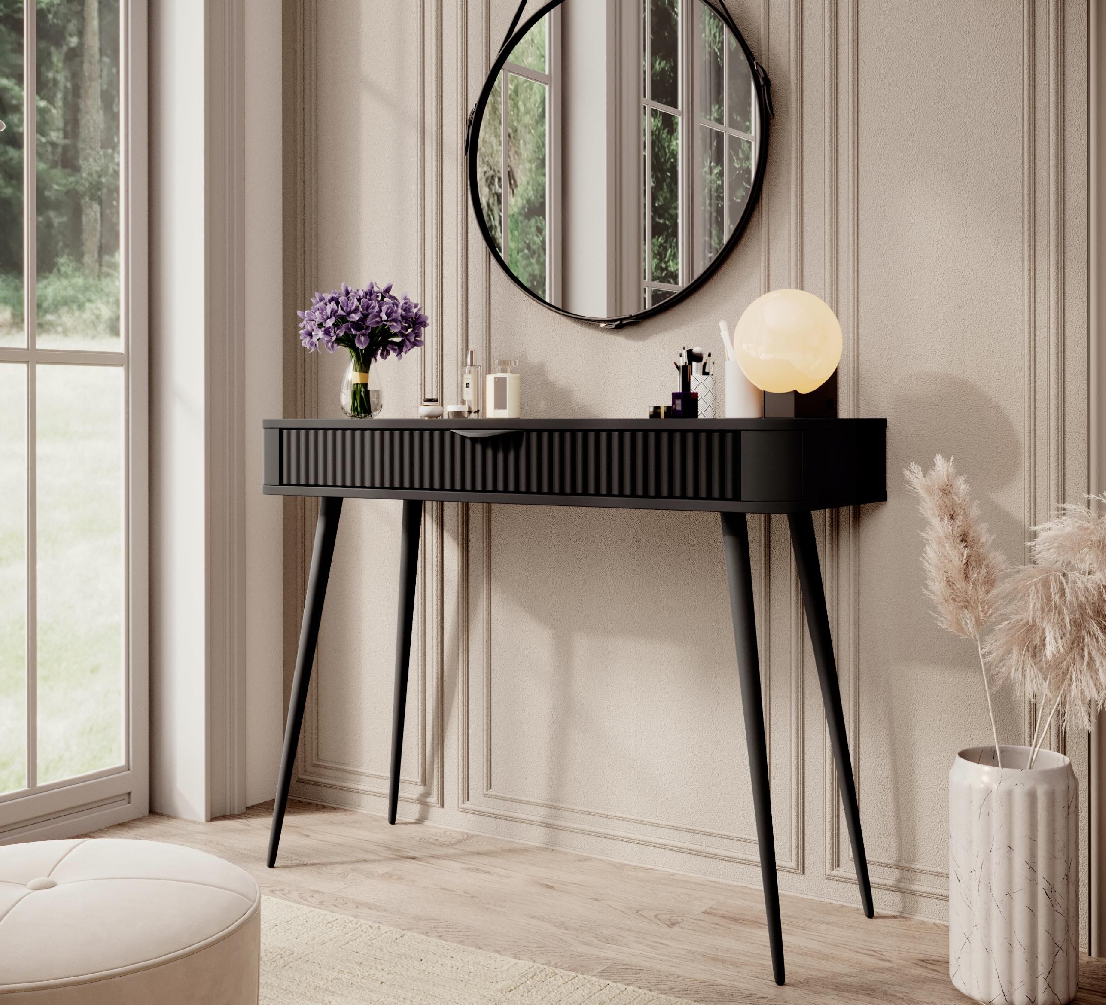 Czarna toaletka z kolekcji LANTE to doskonały wybór dla osób, które szukają mebla wyrazistego, a jednocześnie subtelnego w formie. Głęboka czerń w matowym wykończeniu wnosi do wnętrza odważny, nowoczesny charakter, tworząc eleganckie tło dla codziennych rytuałów pielęgnacyjnych. Całość osadzona została na wysokich, walcowatych nogach z metalu, które podkreślają smukłą sylwetkę mebla i nadają mu wizualnej lekkości.