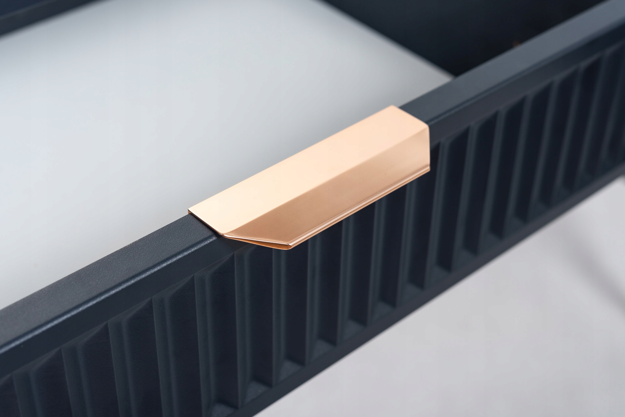 Frezowane fronty stanowią nie tylko estetyczny detal, ale również dodają subtelnej tekstury, która przyciąga wzrok. Dzięki miedzianym uchwytom toaletka zyskuje dodatkowy wymiar elegancji, harmonizując z nowoczesnymi trendami.