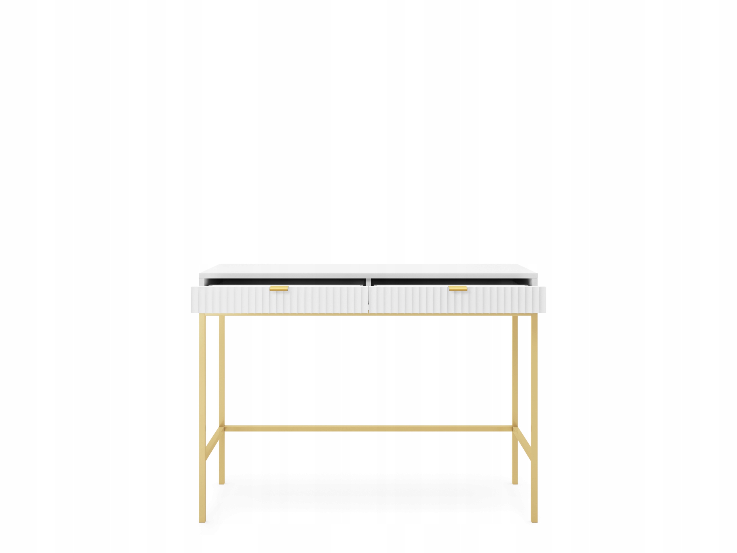 Toaletka BELLAZA to wyjątkowa propozycja dla osób ceniących nowoczesny design i funkcjonalność. Białe, frezowane fronty w połączeniu z złotymi, metalowymi nóżkami tworzą elegancki i harmonijny wygląd, który doskonale wpasuje się w różnorodne wnętrza – od nowoczesnych salonów po sypialnie czy gabinety.
