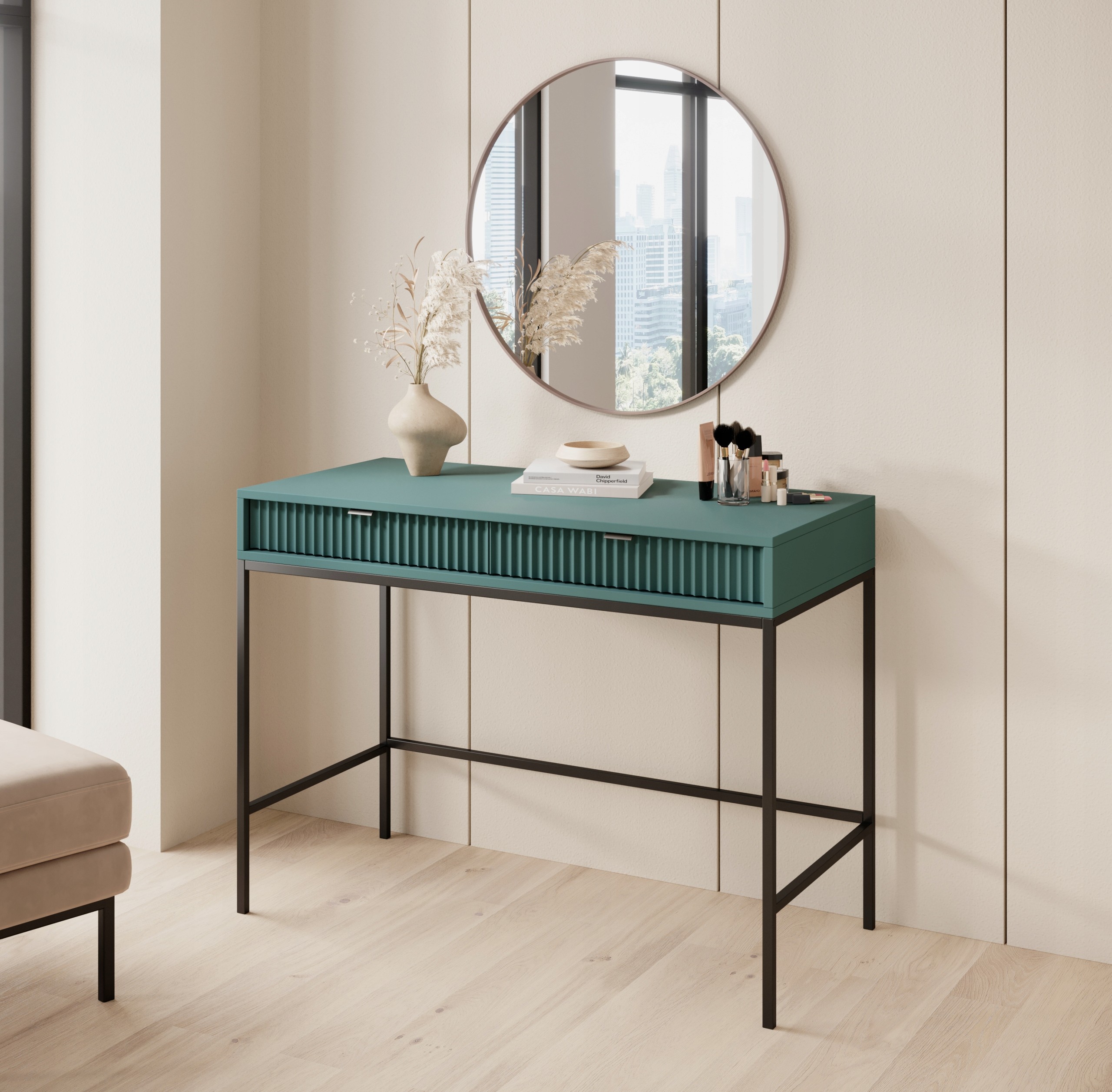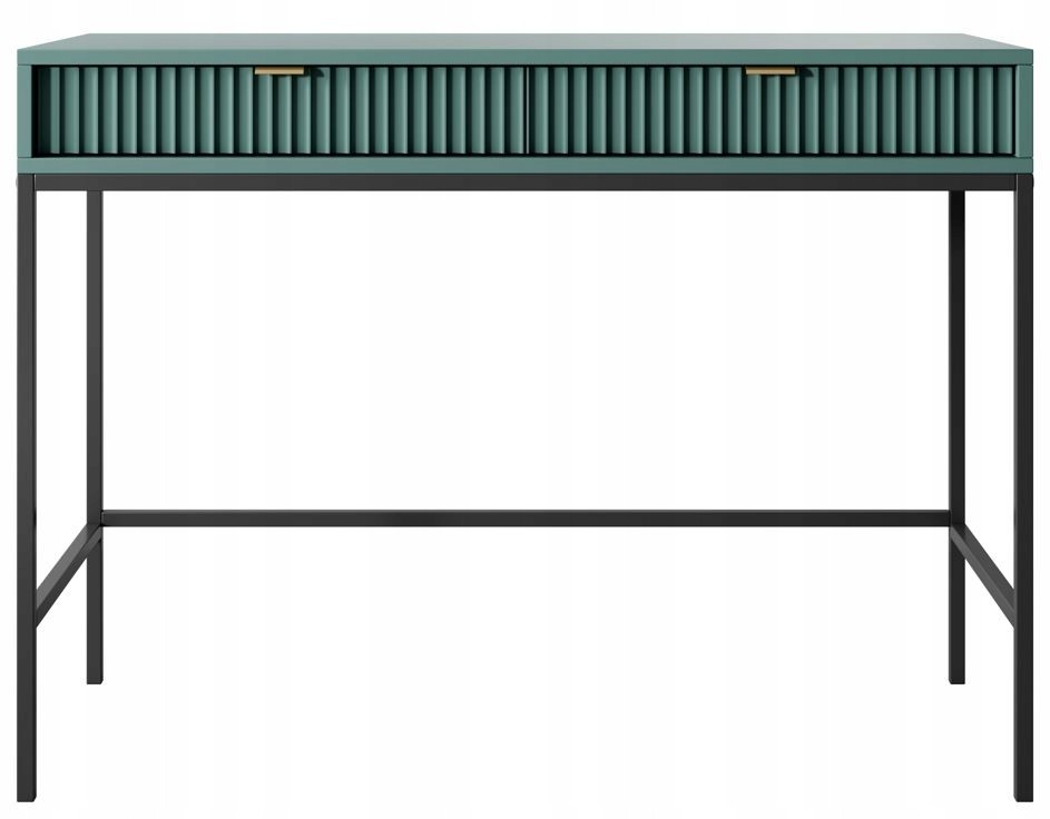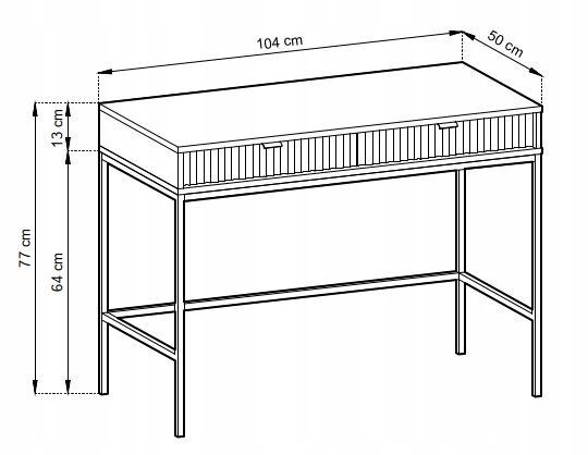 Toaletka z kolekcji BELLAZA to elegancki i nowoczesny mebel w kolorze labrador, doskonały do aranżacji wnętrz w stylu glamour lub minimalistycznym. Charakterystyczne ryflowane fronty nadają jej subtelny i wyrafinowany wygląd, a czarne, metalowe nóżki o wysokości 64 cm, malowane proszkowo, zapewniają stabilność oraz stylowy kontrast. Mebel ma wymiary 104 cm szerokości, 50 cm głębokości i 77 cm wysokości, co sprawia, że doskonale wpisuje się w przestrzeń jako funkcjonalny element wystroju. Toaletka została wykonana z solidnych materiałów, takich jak płyta laminowana o grubości 16 mm na korpusie oraz płyta MDF o grubości 18 mm na frontach, co zapewnia jej trwałość i odporność na codzienne użytkowanie. Uchwyty z aluminium w kolorze czarnym harmonizują z całością, dodając elegancji. Mebel zabezpieczony jest obrzeżami ABS, co zwiększa odporność na uszkodzenia. Cała konstrukcja jest solidna i trwała, a toaletka wyprodukowana została w Polsce. Dodatkowo, dostępna jest również wersja ze złotymi nóżkami i uchwytami, która podkreśla jej luksusowy charakter i umożliwia dopasowanie do różnych stylów wnętrz.