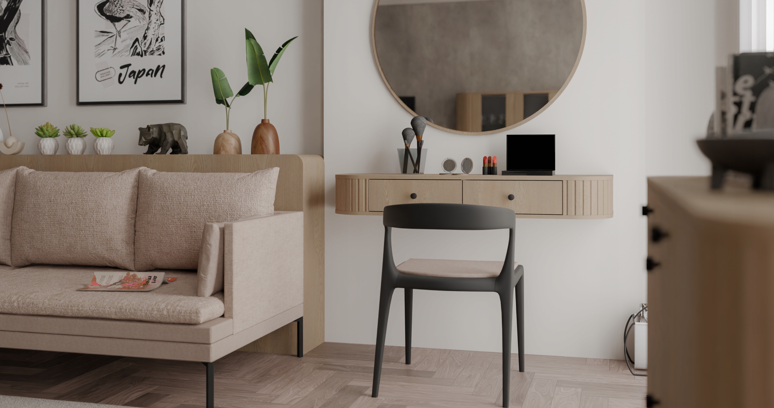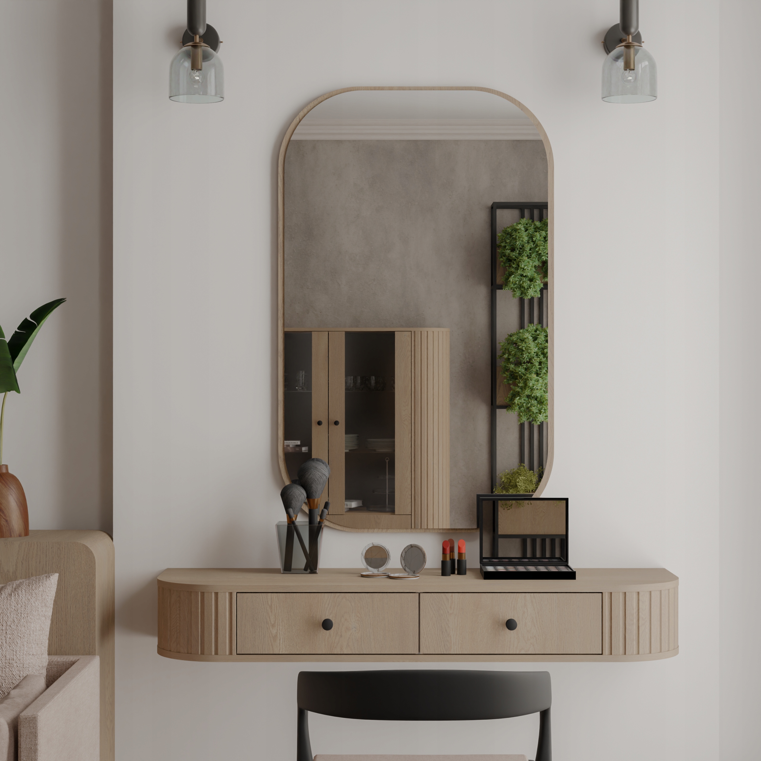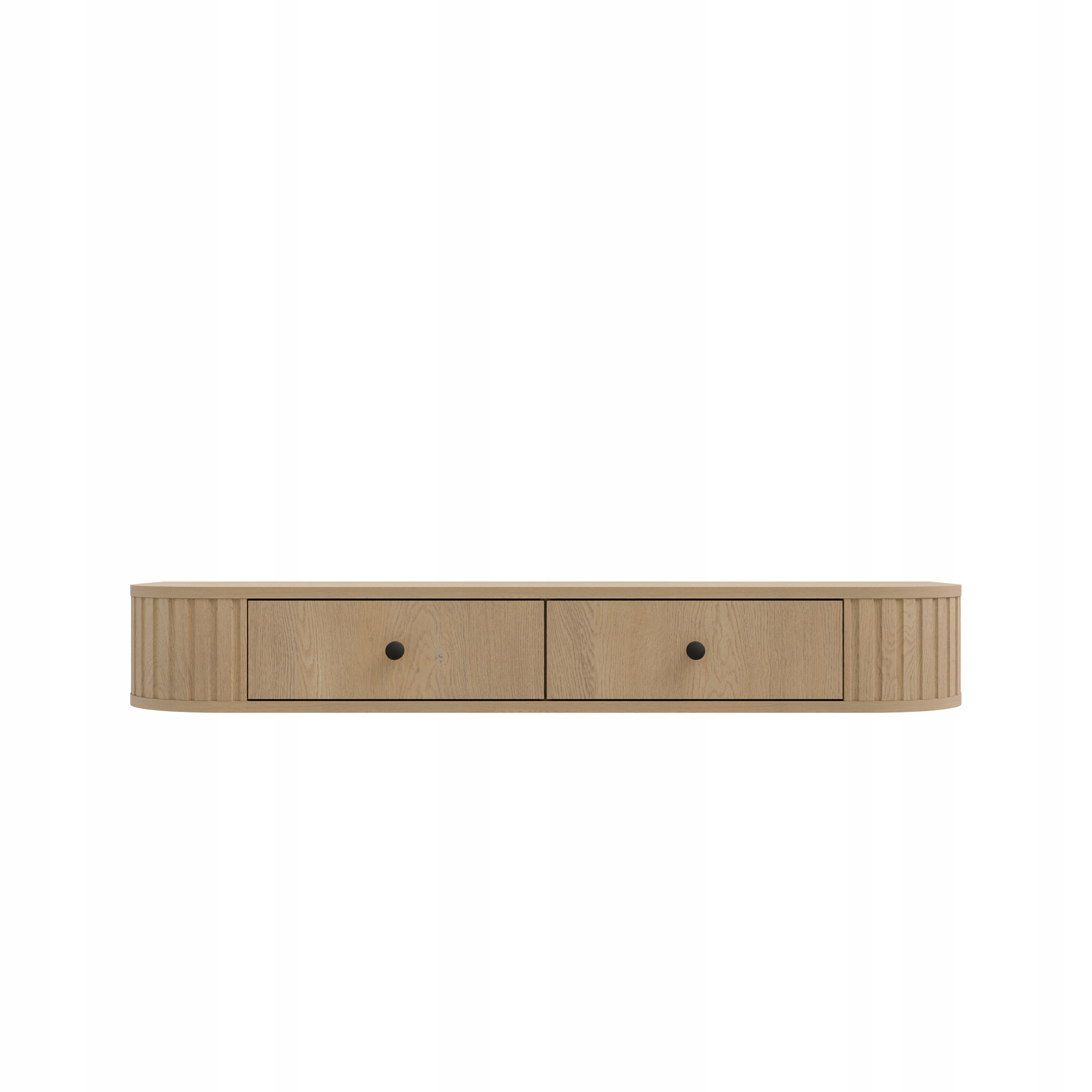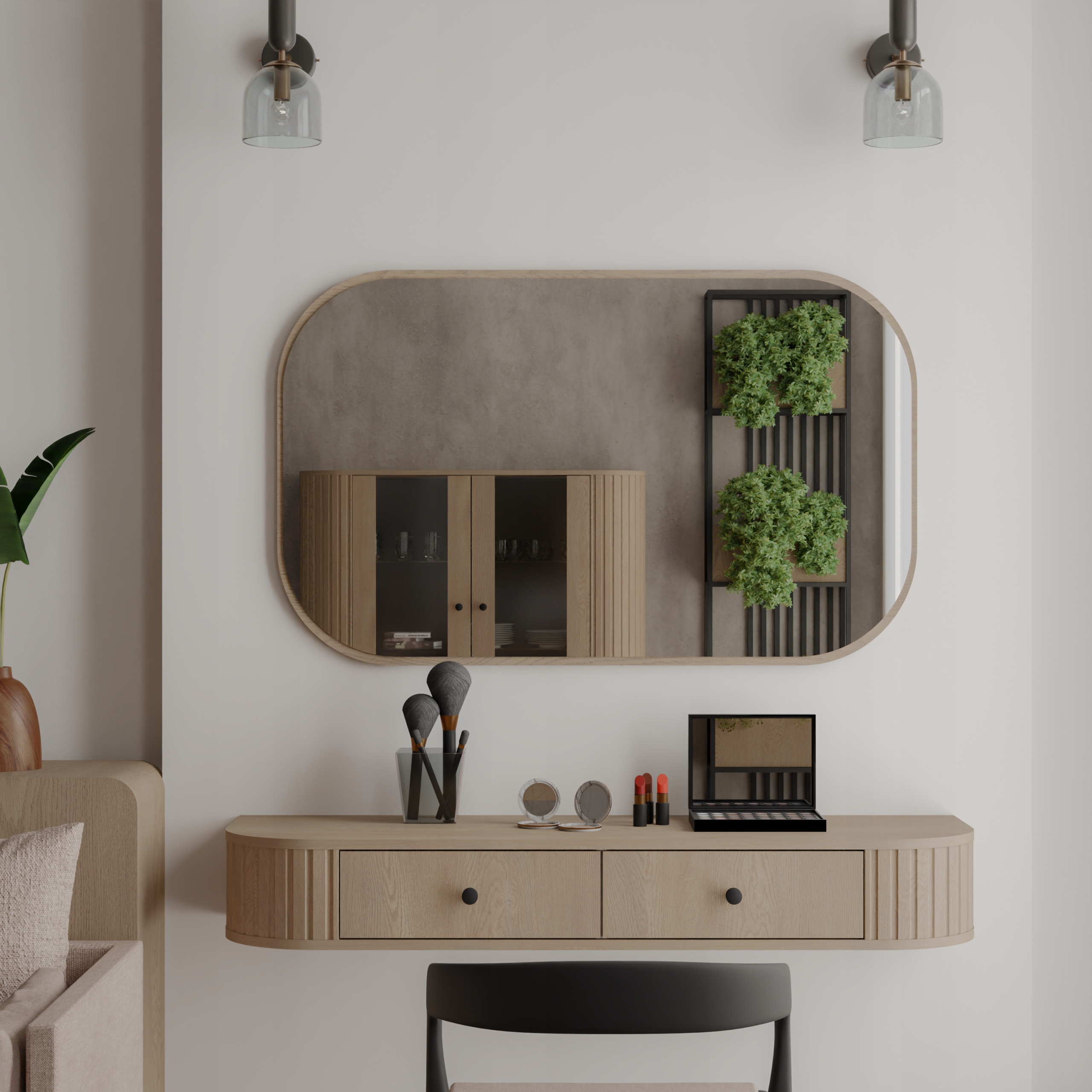 Toaletka z kolekcji OVALIO została zaprojektowana jako funkcjonalne i eleganckie miejsce do codziennego użytkowania. Dwie pojemne szuflady pozwalają wygodnie przechowywać kosmetyki oraz drobne akcesoria, pomagając utrzymać porządek w przestrzeni. Smukła, wisząca konstrukcja nadaje meblowi lekkości i pozwala optycznie powiększyć pomieszczenie, a frezowane boki stanowią charakterystyczny element dekoracyjny całej kolekcji.